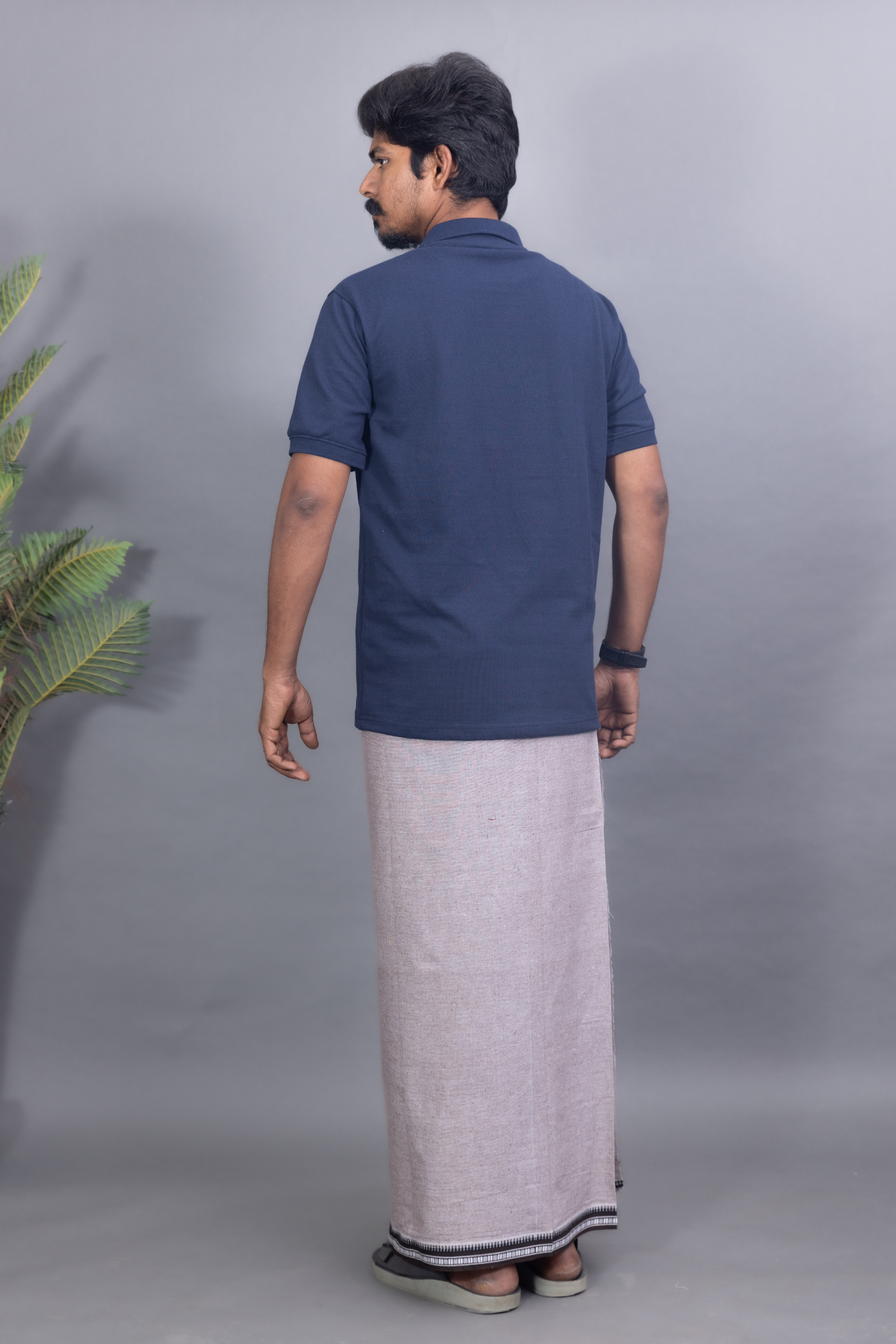 The silver grey cotton dhoti offers a clean, minimal look with a classic border, while the navy blue T-shirt adds a modern touch that pairs effortlessly with traditional wear. Made with a soft and breathable cotton blend, the dhoti is lightweight and comfortable for long hours.